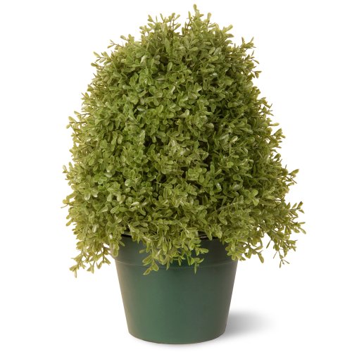 The boxwood tree stands 15-inch tall and comes in a 7-inch round dark green plastic pot. It can be used indoors or outdoors. It requires no watering or sunlight and it is resistant to animals and insects.